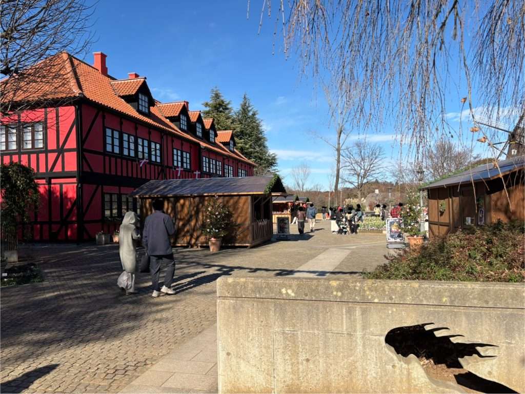 アンデルセン公園には東、西、南、北の4つの駐車場があるのですが、南駐車場に面した入口から入園するとすぐに石畳のおしゃれな広場があり、そこでクリスマスマーケットが催されています。