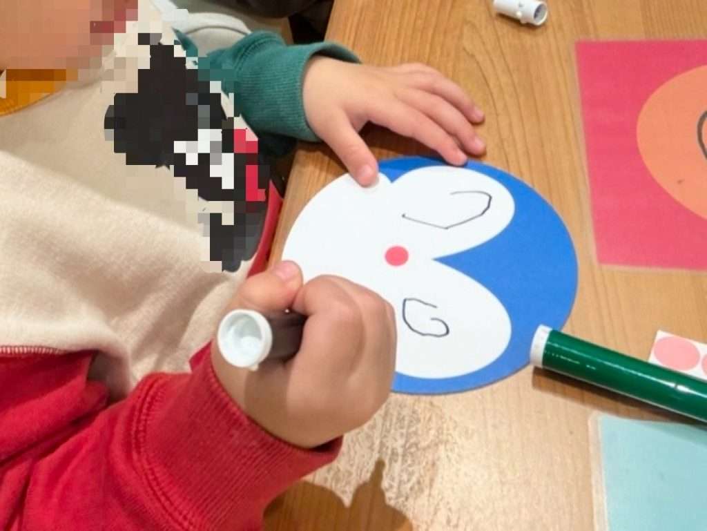 お面を作るときにどれか1つのキャラクターを選ぶと、スタッフの方が顔の無いキャラクターの紙をくれます。お子さんが紙にキャラクターの顔を描いたらスタッフの方がキャラクターの紙に、頭に装着する用のベルト(紙製)を付けてくれて完成です。