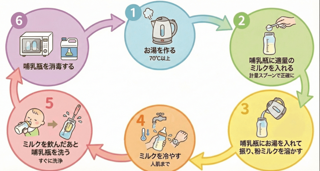 一般的な粉ミルクの調製〜後片付けの方法は次のように言えます。基本的には1〜6の工程を繰り返していきます。